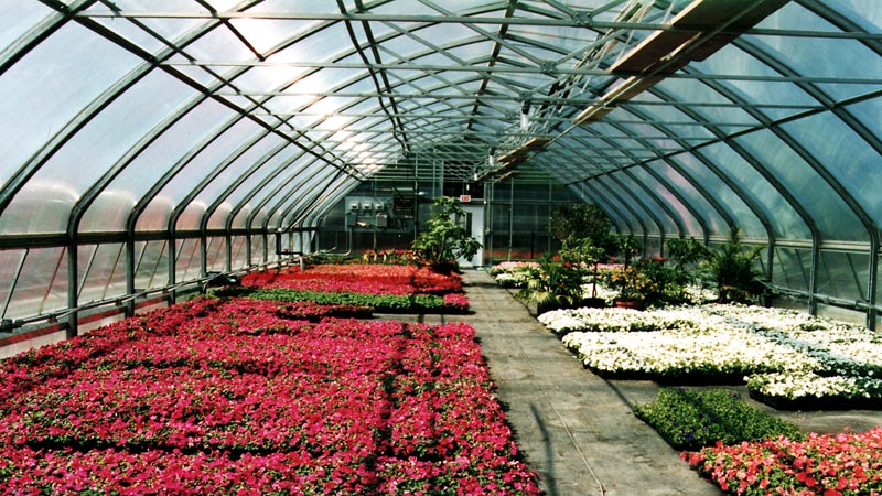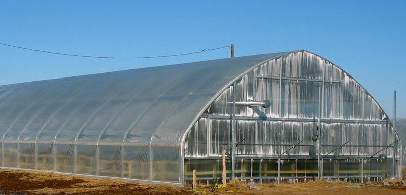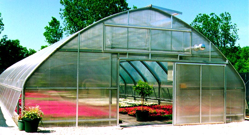 This structure features hard skinned glazing in multilayered polycarbonate panels, roof and sidewall ventilation, and a custom sized sliding door.
